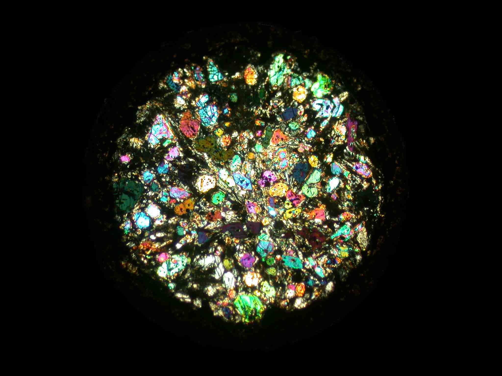 Chondrules began as molten droplets in the great disk of gas and particles that eventually came together to form the sun and planets. They range in size from a fraction of a millimeter to a few millimeters in diameter. The chondrule above -- from a slice of the Allende meteorite at the American Museum of Natural History -- is 2.2 millimeters across and has been photographed through a microscope with cross-polorized light to reveal its complex crystalline structure. Such a structure indicates that chondrules were formed by rapid heating and cooling, but how that process came about remains a subject of debate. The oldest meteorites, like Allende, have preserved the most pristine chondrules as vestiges of the earliest events in the life of the solar system.