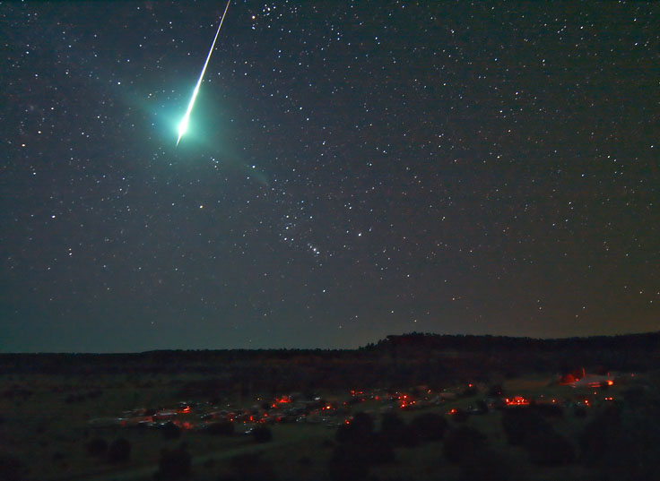 So, if meteorites come from asteroids, how do they get from the Asteroid Belt to the Earth? The answer is that an asteroid must somehow be pushed out of its orbit, and that could happen most easily if one asteroid hits another one. The impact would not only change the asteroid's course, but it could be strong enough to shatter the rock into many pieces, releasing even parts of the core to fly free as chunks of iron. When these pieces of an asteroid happen to fly near the Earth, our planet's gravity pulls them in, and they fall at great speed through our atmosphere. Traveling so fast as they plummet to earth, they become very hot. Most burn up, and sometimes we see these as streaks of light or occasionally balls of fire in the night sky. When a piece of rock from space enters our atmosphere, we call it a meteorite.